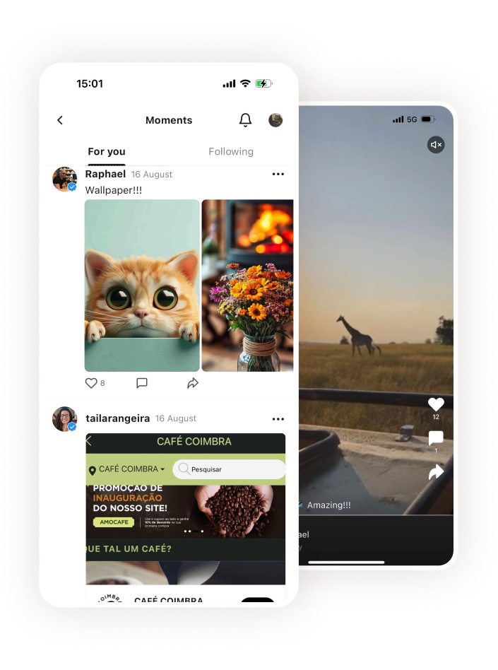 Poste e Compartilhe: Capture e compartilhe sua vida com fotos, vídeos e atualizações de texto. Documente aventuras diárias e momentos especiais com o Momentos. Interaja com uma comunidade mais ampla comentando em postagens, curtindo conteúdos e seguindo usuários para se manter atualizado com as atividades mais recentes.