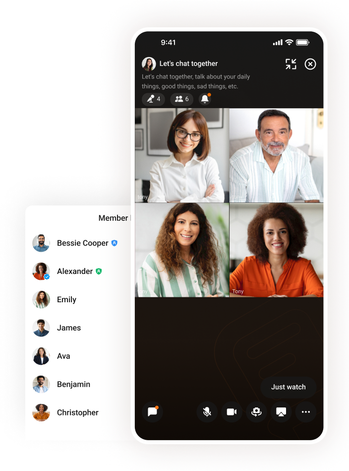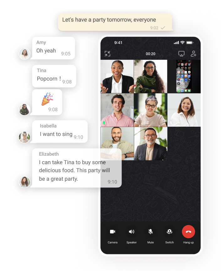 Transforme seus chats em grupo em eventos ao vivo com a Sala. Se você está organizando um webinar, transmitindo um evento familiar ou conduzindo uma sessão de perguntas e respostas ao vivo, a Sala permite conectar-se com múltiplos participantes em tempo real. Desfrute de vídeo e áudio de alta qualidade para uma experiência contínua e envolvente.
